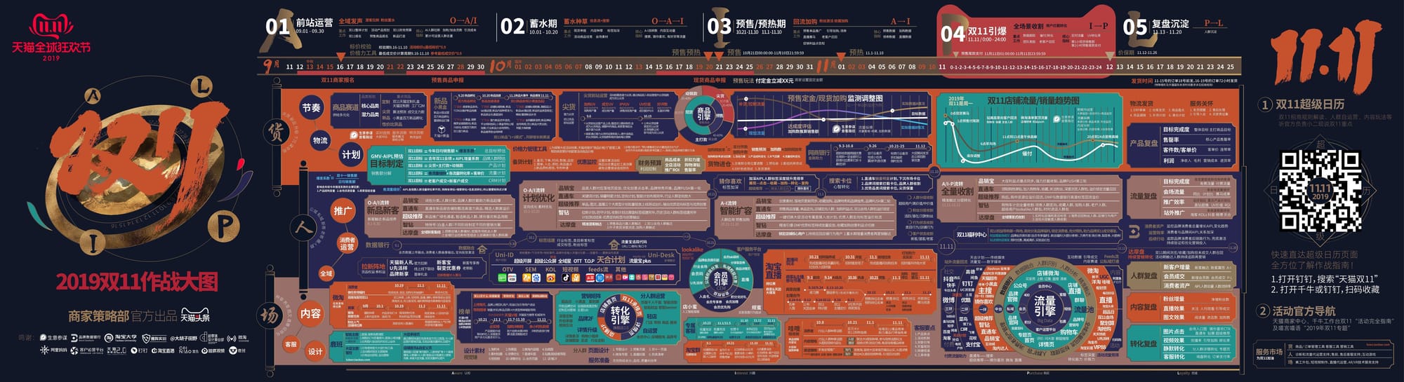 每年在雙十一前夕,都會花時間去讀一下天貓推出的雙十一作戰大圖,了解在前站運營期、蓄水期、預售/預熱期、雙11當天,對於貨、人、場,要做哪些規劃佈局執行。