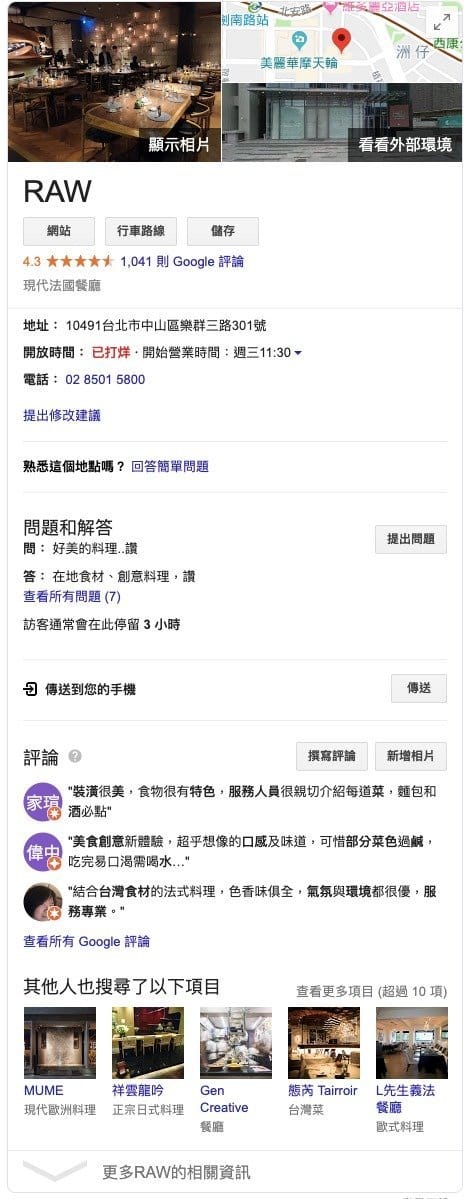 5.Google My Business Knowledge Panel:可以快速觀看商家提供的資訊