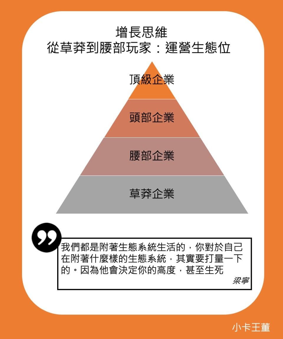所有人都起於草莽,大家都在某個生態系統裡生存,生態系統是豐盛還是貧脊,是正在發展還是正在消失,其實從根本上決定了企業的進退生死。而腰部企業的要點,就是看到生態系統的變化,作出自己的選擇。