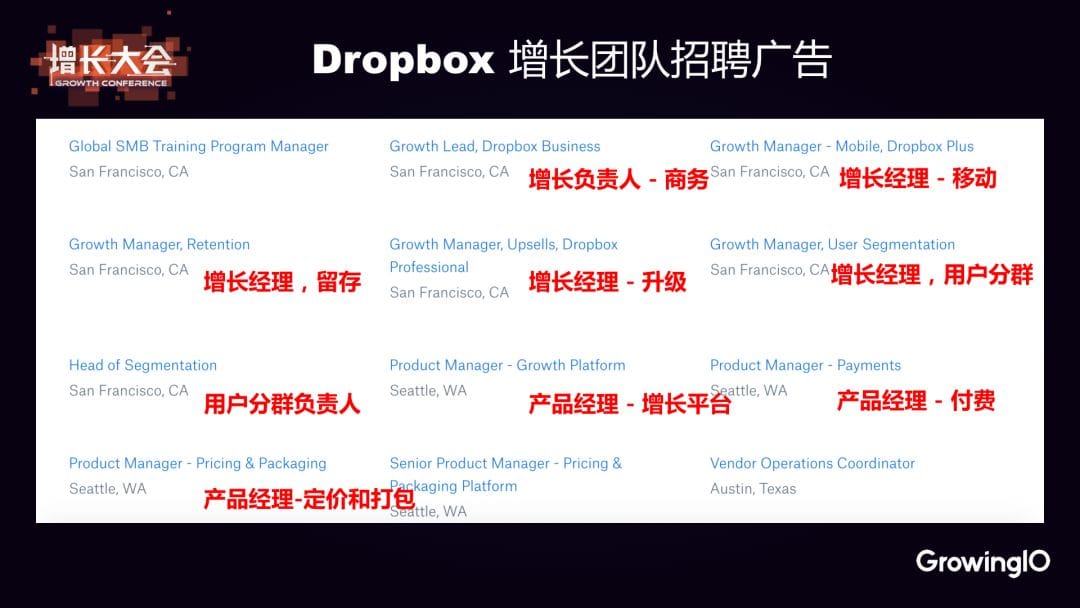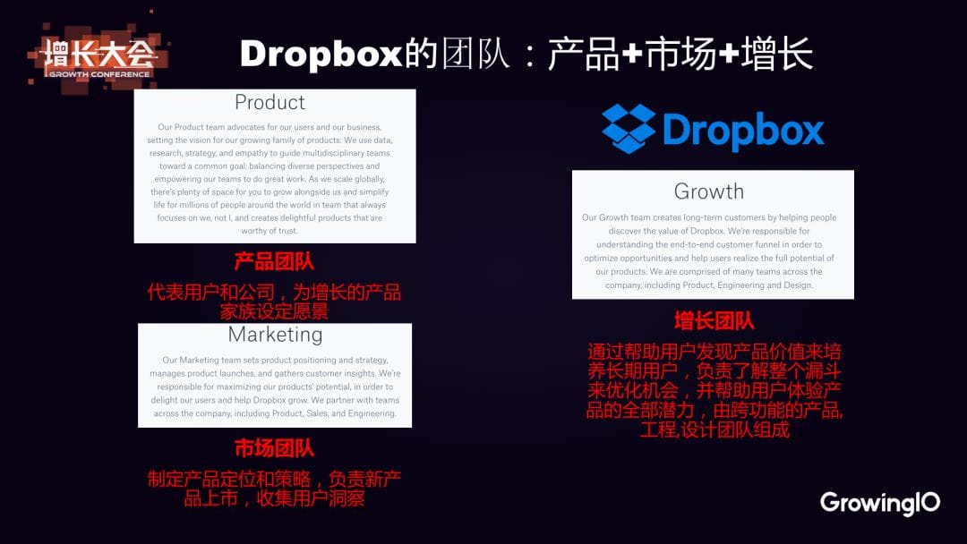 Dropbox 是一個很神奇的團隊,你可以從公司官網上看到他們完整的團隊構架,以及每個團隊的功能。比如從上面這張圖我們可以清晰地感知到: 產品團隊的職責是代表用戶和公司設定願景,不斷的開發新的產品; 市場團隊是制定產品定位和策略,負責新產品上市,收集用戶洞察; 增長團隊就是通過幫助用戶發現產品價值來培養長期用戶,負責瞭解整個漏斗來優化機會,幫助用戶體驗產品的全部潛力,這是由跨功能的產品工程設計團隊組成的。 看了這三個定義,我們就知道產品是創造價值,而市場和增長團隊更多的是傳播價值。只是市場團隊是負責的是新用戶,而增長團隊負責的更多是已經進來的用戶,他們需要讓用戶在整個漏斗里盡量順暢地成長為長期用戶。 在功能設置上,增長團隊也非常清晰,這是一個跨功能的團隊,有程序師、設計師等等。這是非常清晰的規劃,也是值得很多公司借鑒的。