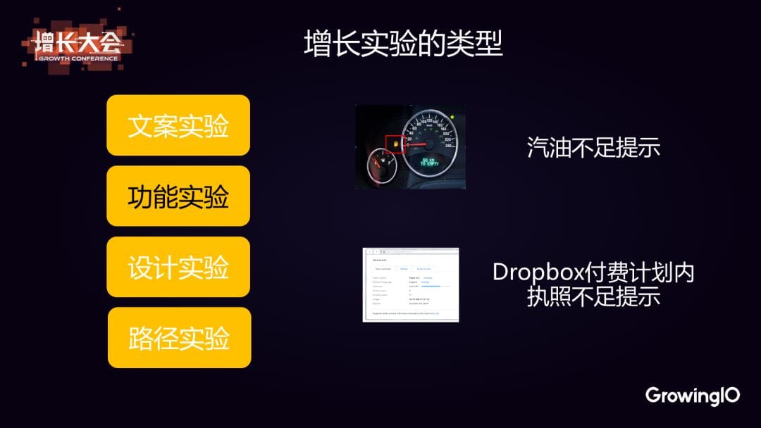 第二個例子就是功能實驗的典型。大家都知道如果汽油不足,就會收到一個提示,基於這個生活觀察,Dropbox 也上線了付費計劃內權限不足的提示,收到了很好的效果。 所以增長實驗可以採用各種各樣的方式,尤其是用戶基數已經相當大的時候。找到關鍵點,實踐一些非常小的增長實驗就可以獲得意想不到的結果。 03