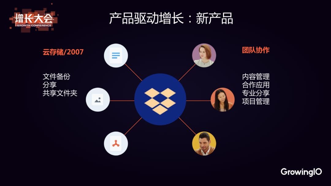 在 2007 年剛開始的時候,Dropbox 只是一個非常簡單的雲存儲產品,就文件備份、分享和共享文件夾三個功能。到了現在,它其實已經是一個團隊協作產品了,用戶可以在這裡完成內容管理、合作應用、專業分享和項目管理。 所以要不斷地去開拓產品的生態系統,拓展新的產品。這也是 Dropbox 增長策略中非常重要的一個點。 基於以上幾點,我認為產品和創新是增長的第一驅動力,因為後續任何增長的手段,都會依賴或者受限於此。 02