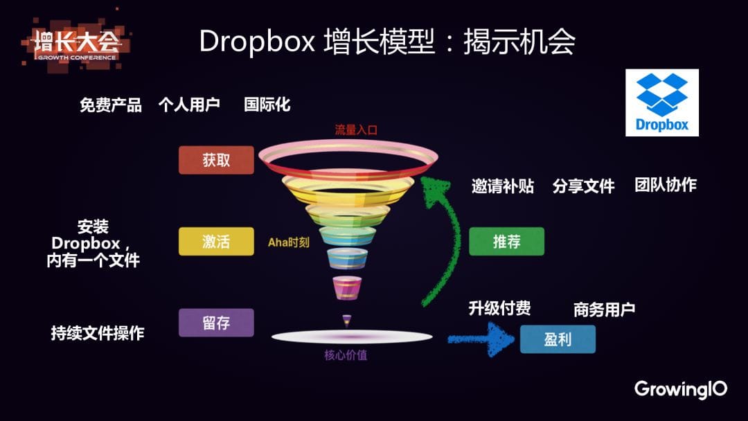 即找到正確合理的北極星指標,然後通過數據監測進展,通過模型解構的方式分析商業模式,找到增長機會,以及通過 A/B 測試去具體實踐落地改善,進而驅動增長。 接下來我就以 Dropbox 為例,來具體講講這幾個環節。
