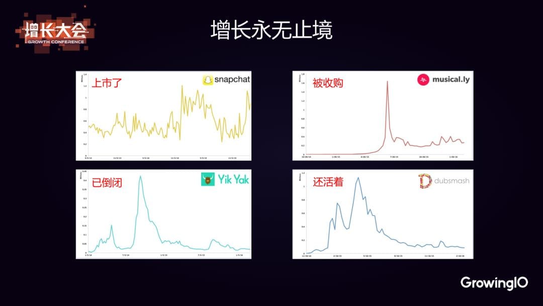 這是四款曾經發展非常好的 App 初期的增長曲線,可以看到,他們在經歷了平緩的冷啓動之後都出現了爆發式的增長。 然後呢?我們來看看發生了什麼。more