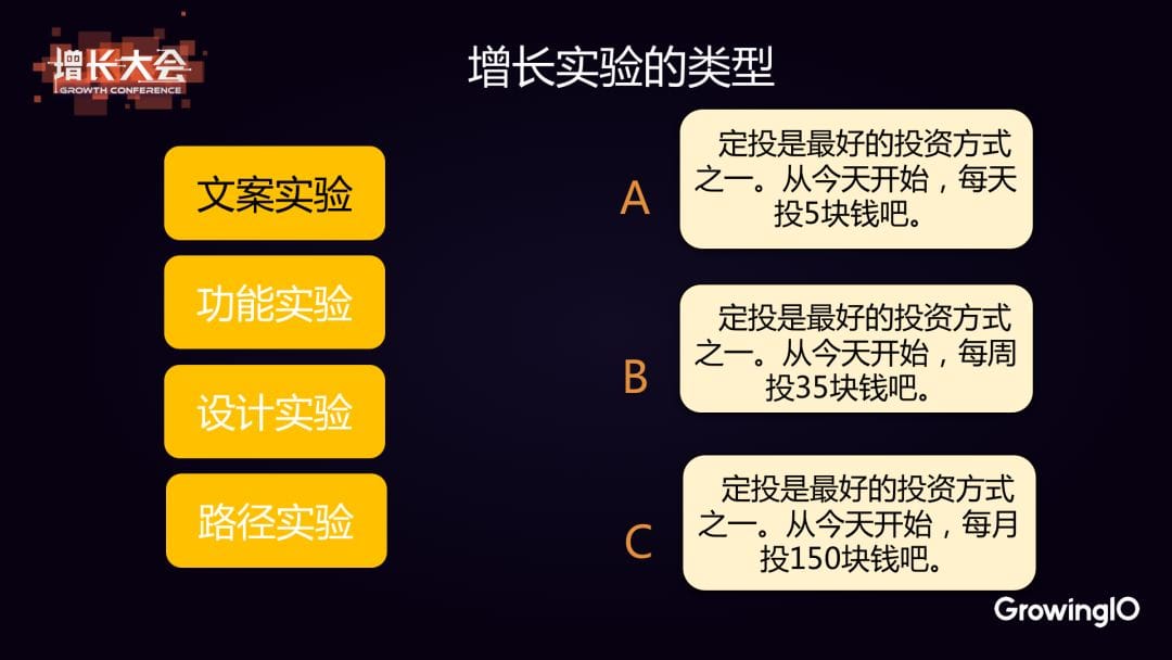 增長實驗有幾個類型:文案實驗、功能試驗、設計實驗和路徑實驗。 上圖是我們自己做過的一個很小的文案實驗。 Acorns 是一個投資軟件,我們希望用戶使用定期投資這樣的功能。於是我們把所有進來的人分為三組,每個組給他們不同的文案。 每天 5 塊,每周 35 塊,每月 150 塊。實際上數額是一樣的,但是轉化率差別很大。A 的轉化率是 30%,B 是 11%,C 是 7%。這就是一個行為經濟學的測試,所以大家一定要重視文案。