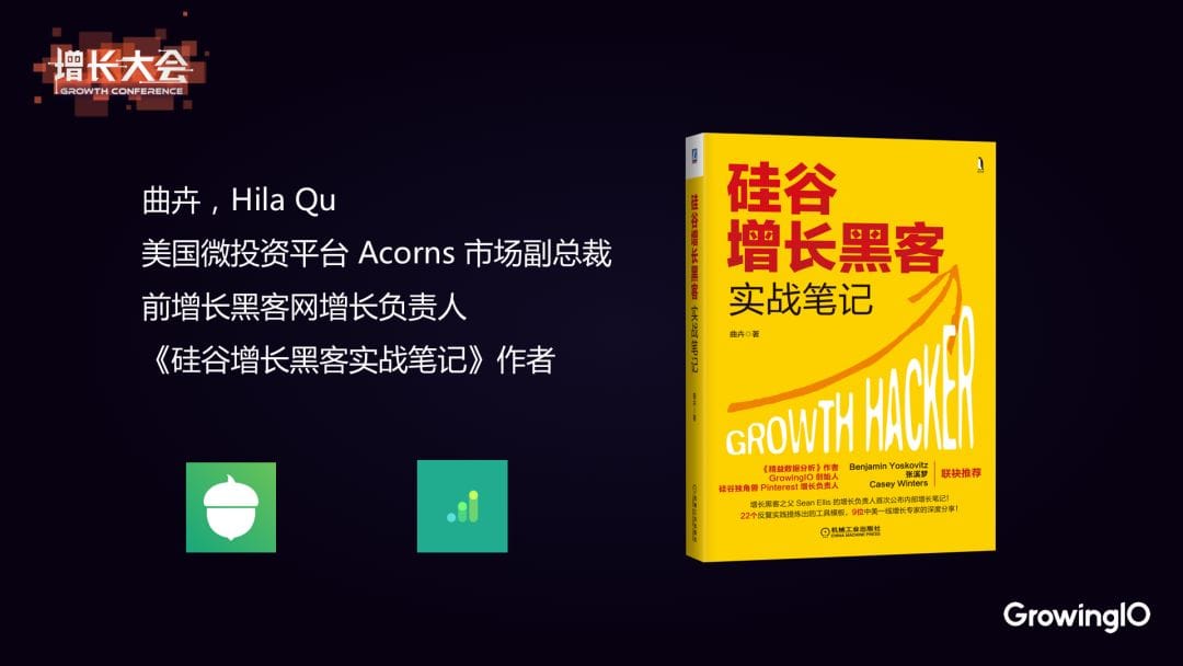 大家好,我是曲卉。 目前在美國最大的微型投資平台 Acorns 擔任市場副總裁,在此之前,我在 Sean Eills 創辦的 Growthhackers.com 擔任增長負責人。在過去的幾年中,我一直在做增長相關的工作。最近也是把這幾年的工作經驗做了一些總結,寫成一本《硅谷增長黑客實戰筆記》。