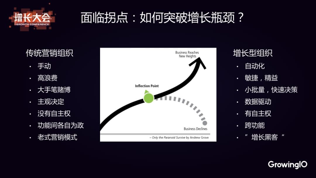 很多公司開始成立增長團隊的原因其實是遭遇增長瓶頸了。Facebook 是第一家正式成立增長團隊的公司,他們當時就是發現增長停滯了,於是才決定成立一個專門的增長團隊來為此負責。 其實做過增長的都知道,公司經歷了一段時間的高速增長之後,一定會經歷一個拐點。這個拐點之後,要麼開始衰落,要麼進一步增長,上升到一個新的台階。很多公司在面臨這樣的拐點時,就會選擇從一個傳統型的營銷組織轉到增長型的組織。