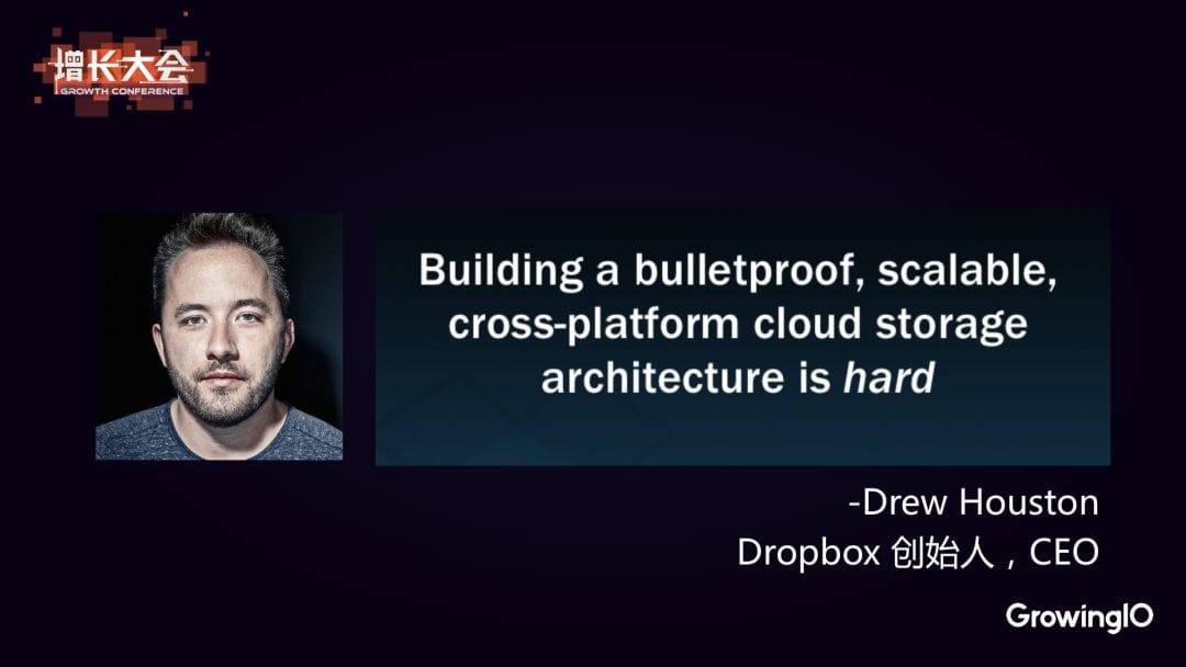 Dropbox 的創始人& CEO Drew Houston 說,這麼多的產品,有哪一個你會用呢?為什麼不用?因為其實打造一個不易崩潰,可擴展且跨平台的雲端儲存產品是很難的。所以其實 Dropbox 創立之初,創始人就把核心競爭力放在了產品本身上面。