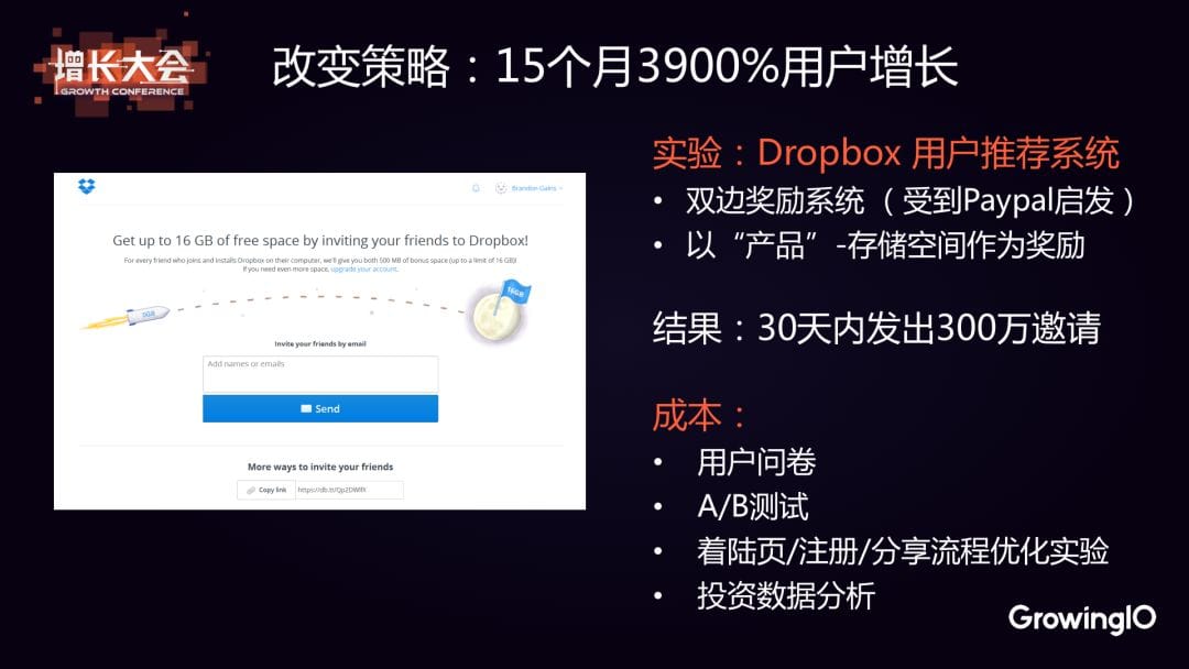 這個實驗的結果是,用戶在 30 天內發出了 300 萬個邀請,在 15 個月內出現了 3900% 的用戶增長。而他們的成本只是一些用戶問卷、A/B 測試、一系列的流程優化實驗和數據分析。 通過以上兩個事件,Dropbox 團隊不再盲目地迷信最佳實踐,而是從自身產品的實際情況上思考問題。因為在一個產品、一個市場上行得通的技巧,可能放在另一個產品、另一個市場上就完全行不通。這也給 Dropbox 的科學增長模式打下了良好的基礎。