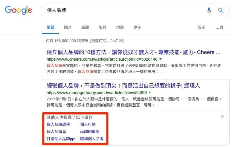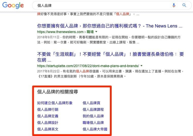 這一部分,也可以從 Google 的 SEO(搜尋引擎優化)來聊,透過關鍵字的研究,我們得知使用者習慣搜尋字詞是什麼和搜尋熱度,可以得知使用者的問題點想知道的資訊是什麼,進而知道要做什麼樣的內容規劃撰寫,使用google trend 是一種方式,也可以透過 google的建議,如下圖:
