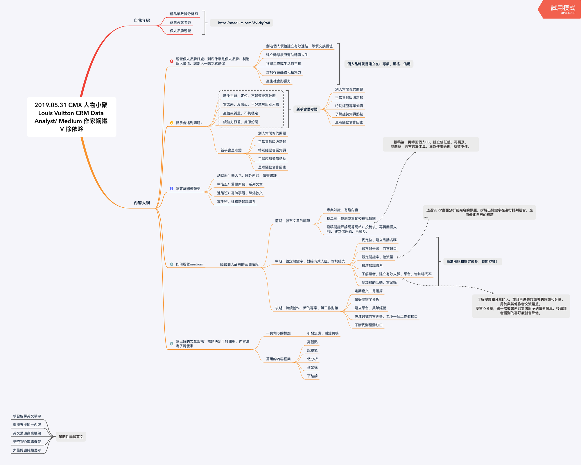 切入重點,這次活動筆記,第一次嘗試著用心智圖來做,分享給大家,期待這個習慣可以持續維持,就是要「刻意練習」~