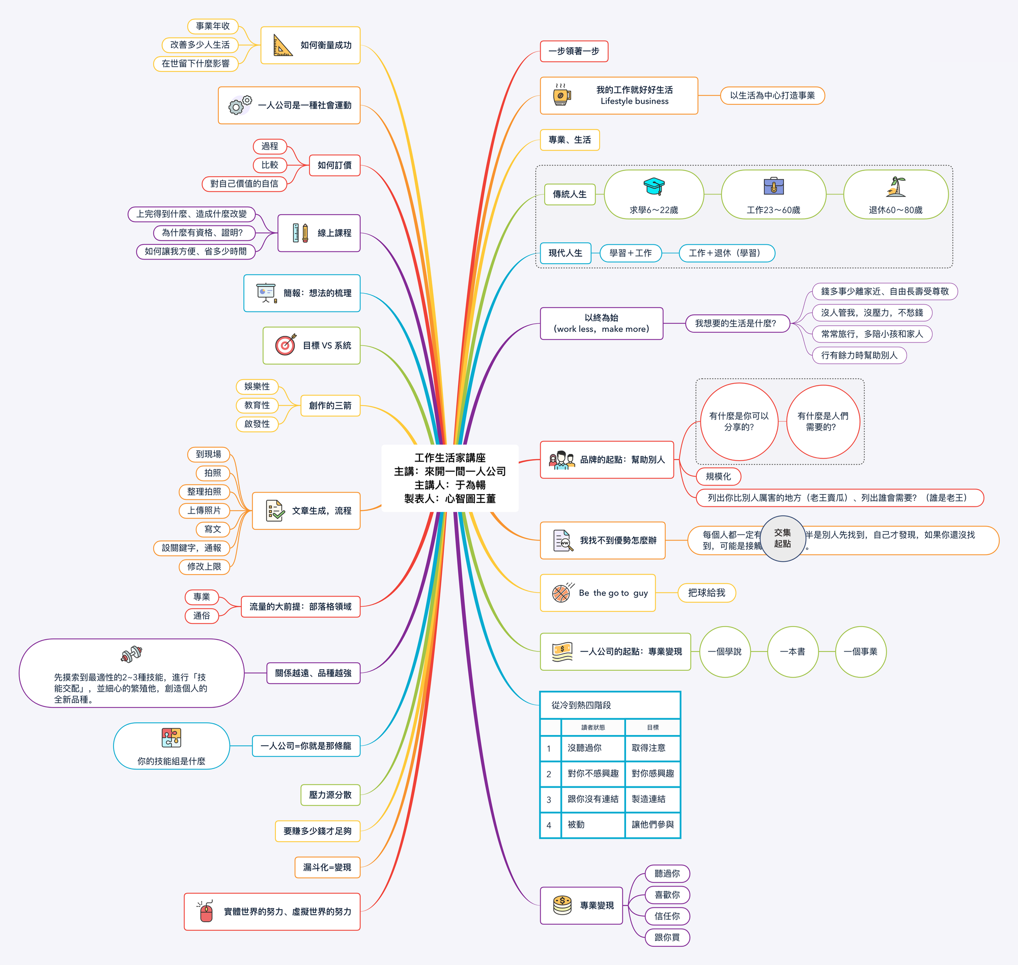 今年開始關注個人品牌經營這個議題,就有發現于為暢老師在開班授課,這次工作生活家講座有邀請了于老師來做分享,講座中除了于老師的經驗外,也有分享到「一人公司」書中的金句摘要,獲得蠻多收穫。
